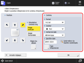 Ajoute la date (année, mois et jour) lors de la copie. Vous pouvez spécifier la date à imprimer.
