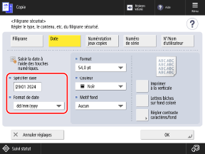 Les réglages configurés dans l'écran [Filigrane sécurisé] sont appliqués au format de caractère de l'échantillon d'impression.