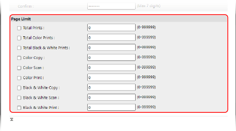 Pour limiter le nombre de pages pouvant être imprimées, numérisées ou copiez, sélectionnez l’élément souhaité et saisissez le nombre maximal de pages.