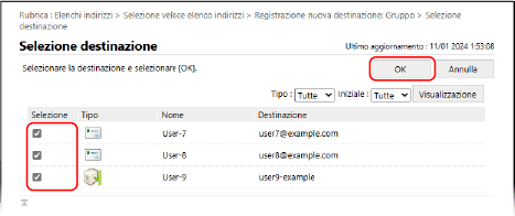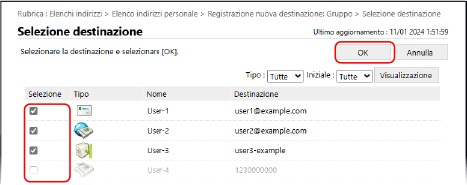 Selezionare le caselle di controllo delle destinazioni da registrare nel gruppo e fare clic su [OK].