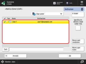Quando le informazioni utente sono gestire con un server LDAP, è possibile cercare tali informazioni e specificare le destinazioni dalla schermata di scansione (Scansione e invio) del pannello di controllo.