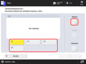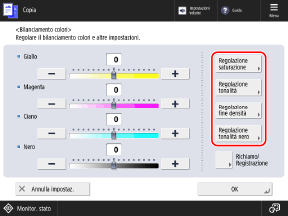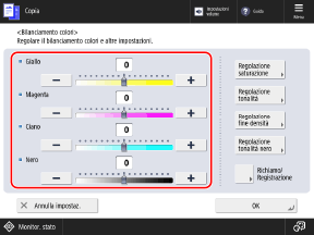 Se si usano spesso originali con tonalità specifiche, è possibile registrare le impostazioni colore regolate. Le impostazioni potranno essere richiamate dalla schermata per la regolazione del bilanciamento colori, in modo da non dover effettuare la regolazione ogni volta.
