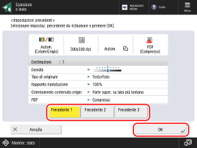 È possibile premere [Impostazioni precedenti] per richiamare le impostazioni usate in passato per inviare i dati scansionati. Anche la destinazione di invio viene applicata insieme alle impostazioni richiamate.