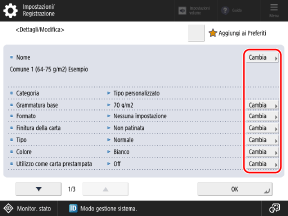 [Impostazioni gestione tipo di carta]. Selezionare il tipo di carta e premere [Dettagli/Modifica].