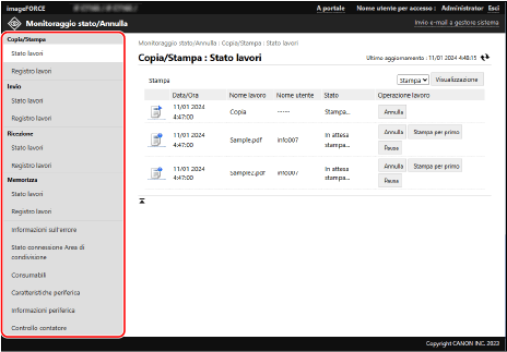 È possibile controllare lo stato di elaborazione e i registri di ciascuna funzione, lo stato operativo della macchina e le informazioni sugli errori da [Monitoraggio stato/Annulla] nella IU remota.