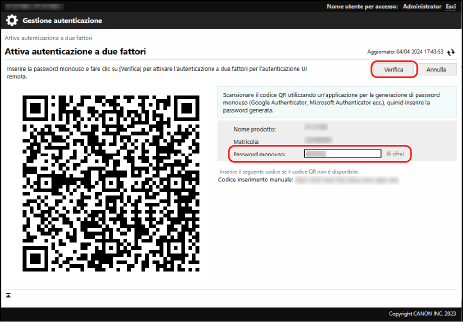 Quando si accede con il nome utente "Administrator," modificare la password predefinita "7654321" con una nuova password. [Registra/Modifica utente autenticazione]