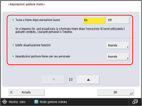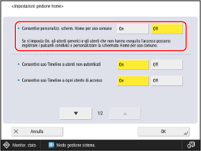 Per limitare le voci che ciascun utente può personalizzare nella schermata [Home], premere [Imposta], selezionare [Off] per ogni voce da limitare, quindi premere [OK].