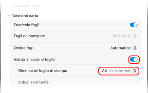 Attivare [Adatta in scala al foglio] e selezionare il formato carta su cui stampare in [Dimensioni foglio di stampa].