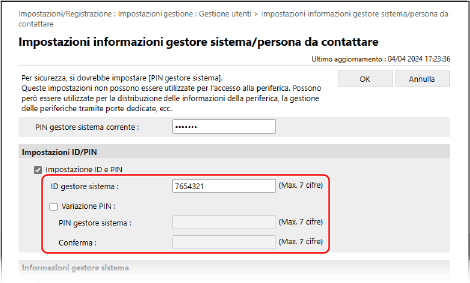Specificare [Informazioni gestore sistema] e [Informazioni persona da contattare] in base alle esigenze.