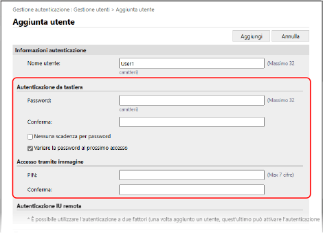 Inserire le informazioni utente e configurare altre impostazioni in base alle esigenze. Schermate [Aggiunta utente] e [Modifica informazioni utente]