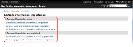 La macchina registra automaticamente le informazioni impostazioni utente e alcune informazioni potrebbero rimanere anche dopo l'eliminazione di un utente. Eliminare manualmente tutte le informazioni di impostazione utente non necessarie in base alle esigenze. È inoltre necessario eliminare le informazioni impostazioni utente quando viene raggiunto il numero massimo di utenti e gruppi di utenti con informazioni impostazioni utente.