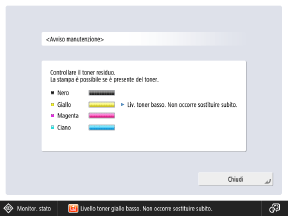 Fino a che la schermata delle notifiche non verrà eliminata, si aprirà ogni volta che la macchina verrà accesa o uscirà dalla modalità sospensione. Per eliminare la schermata delle notifiche, svolgere l'operazione [Cancellazione messaggio errore toner residuo].