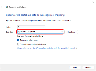Inserire il percorso a Area di condivisione nel campo di inserimento dell'indirizzo.