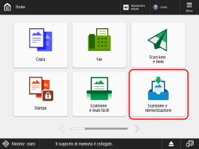 Sul pannello di controllo, scansionare un documento con la macchina da [Scansione e memorizzazione] nella schermata [Home] e salvare i dati scansionati in un dispositivo di memoria USB.