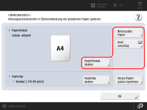 Wenn Papier in einem Format eingelegt ist, das nicht automatisch erkannt wird, oder wenn nach dem Einlegen des Papiers ein anderes Format angezeigt wird, drücken Sie auf [Papierformat ändern], und wählen Sie das Format des eingelegten Papiers aus.