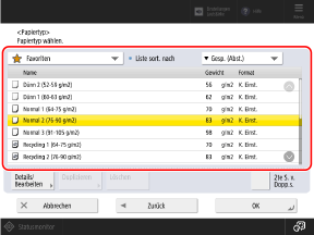 Um einen anwenderdefinierten registrierten Papiertyp einzustellen, registrieren Sie das Format und den Typ als häufig verwendetes Papier und verwenden Sie [Bevorzugtes Papier], um dieses Papier abzurufen.