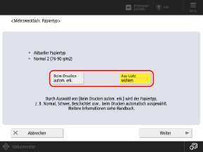 * Wenn Sie im Druckertreiber einen bestimmten Papiertyp eingestellt haben, drücken Sie [Aus Liste wählen], und konfigurieren Sie die Einstellung des Papiertyps für das Gerät manuell. Verwenden Sie nicht [Beim Drucken autom. erk.].