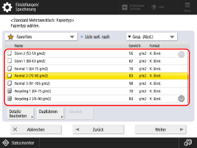 Anstatt das Papierformat und den Papiertyp festzulegen, empfiehlt es sich, die Papierinformationen (Format und Typ) als Favoriten zu speichern, damit Sie diese Informationen auf dem Bildschirm für die Papiereinstellungen abrufen können.