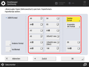 Wenn Sie das Format (Seitenlänge) des Papiers nicht kennen oder mit dem im Druckertreiber eingestellten Papierformat drucken möchten, drücken Sie [Sonderformat]. In diesem Fall brauchen Sie Schritt 2 (Eingabe der Seitenlänge) nicht auszuführen.