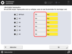 Sie können festlegen, ob die Verwendung der einzelnen Papierzufuhren durch die Anwender eingeschränkt werden soll. Wenn in einer Papierzufuhr Spezialpapier eingelegt ist, können Sie die Einstellungen so konfigurieren, dass dieses Papier nicht versehentlich verwendet werden kann.