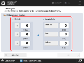 Drucken Sie von einem Computer das "Farbdiagramm für die Zuordnung von RGB-Werten zu Ausgabefarben im Farbdiagramm" auf dem Gerät aus, und beachten Sie die Tabelle, um bestimmte Farben im Profil zu registrieren.