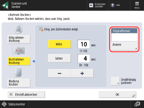 Wenn Sie das Originalformat auf eine Größe einstellen, die größer als das tatsächliche Original ist, oder wenn Sie Seiten eines dicken Buches scannen, können dunkle Ränder und Schatten an den Kanten des Originals erscheinen. Sie können die Einstellungen so konfigurieren, dass diese Ränder oder Schatten beim Scannen gelöscht werden. Sie können auch die Lochung auf dem Original löschen.
