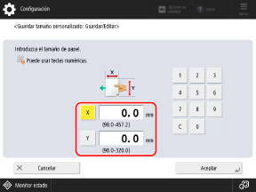 Puede registrar tamaños cuando use con frecuencia un papel de tamaño no estándar específico. Puede recuperar el tamaño en la pantalla de introducción del tamaño, de modo que se ahorra la molestia de tener que introducir el tamaño cada vez.