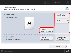 Cuando se carga papel en la bandeja multiuso, aparece la siguiente pantalla en el panel de control. Configure el tamaño y el tipo de papel según el papel cargado.
