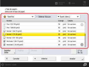 Para establecer un tipo de papel registrado personalizado, registre el tamaño y el tipo como papel de uso frecuente, y utilice [Papel favorito] para recuperar el papel en cuestión.