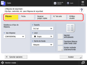 Pantalla de copiaAparece la pantalla [Filigrana de seguridad].