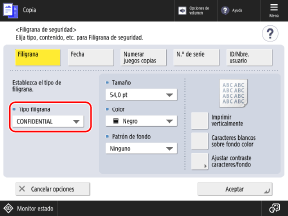 Las opciones configuradas en la pantalla [Filigrana de seguridad] se aplican al formato de caracteres de la impresión de muestra.