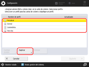 Seleccione y duplique uno de los perfiles guardados previamente en el equipo y cree un perfil para registrar los colores que desea reproducir.