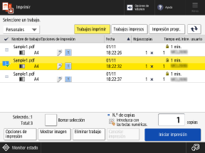 En esta pantalla, puede imprimir documentos en Retención forzada, documentos de Impresión segura o documentos de Impresión segura cifrada. También puede consultar el contenido o cambiar las opciones de impresión de esos documentos y los de Impresión programada.