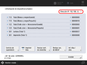 También puede utilizar el procedimiento siguiente para consultar la dirección IPv4 en la pantalla [Información de dispositivo/contador].
