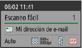 Muestra las opciones de número de destinos, destino*1, tamaño original, resolución, doble cara y formato de archivo.