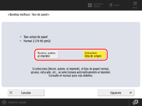* Si configura un tipo de papel específico en el controlador de impresora, pulse [Seleccione lista de origen] y configure manualmente el tipo de papel para el equipo. No utilice [Recon. autom. al imprimir].
