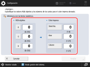 Consulte la tabla impresa en el paso 1 e introduzca los números en [Sheet No.], [Row] y [Column] para los colores que desee reproducir.