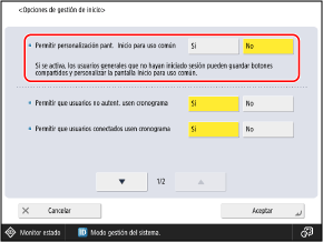 Establezca esta opción en [Sí] para permitir a los usuarios que no sean administradores añadir botones compartidos y realizar cambios en las opciones de [Personalizar para uso común].