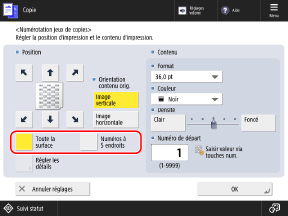 * Vous ne pouvez pas sélectionner [Toute la surface] et [Numéros à 5 endroits] si les réglages sont configurés pour ajouter d'autres informations aux numéros de jeu de copie.