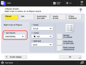 Écran de copieL'écran [Filigrane sécurisé] s'affiche.