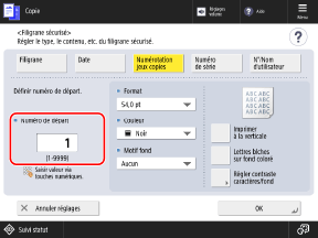 Vous pouvez incorporer des numéros de jeu de copies (pour indiquer l'ordre des jeux de copies). Ils peuvent être utilisés comme numéros de contrôle pour chaque jeu de copies.