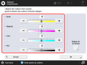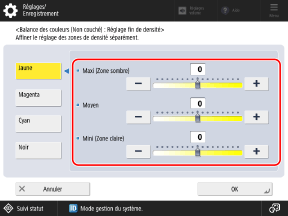 Réglez l’équilibre des couleurs jaune, magenta, cyan et noir lors de l’impression en couleur. Vous pouvez régler les niveaux des trois zones de densité pour chaque couleur.