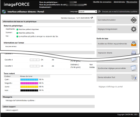 Lorsque vous vous connectez à l’interface utilisateur distante, la page du Portail (page d’accueil de l’interface utilisateur distante) s’affiche. Depuis cette page, vous pouvez vérifier l’état d’utilisation de la machine, afficher diverses informations et changer les paramètres en cliquant sur des boutons.