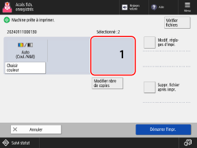 Pour imprimer avec les réglages d'impression enregistrés dans un fichier, n'appuyez pas sur [Modif. réglages d'impr.]. Le fait d'appuyer sur [Modif. réglages d'impr.] peut désactiver les réglages d'impression enregistrés.