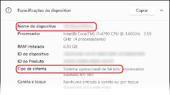 Em [Especificações do dispositivo], verifique o nome do computador e a versão do sistema operacional.