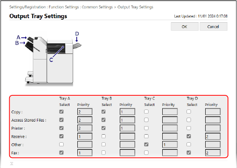 Você também pode especificar várias bandejas de saída para cada função e especificar a prioridade. Neste caso, quando a bandeja de saída de prioridade máxima atinge a capacidade máxima, o destino de saída muda automaticamente para uma bandeja de prioridade mais baixa.