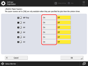 Você pode definir se deseja restringir o uso de cada origem de papel pelos usuários. Quando uma fonte de papel é carregada com papel especial, você pode definir as configurações para evitar que esse papel seja usado inadvertidamente.