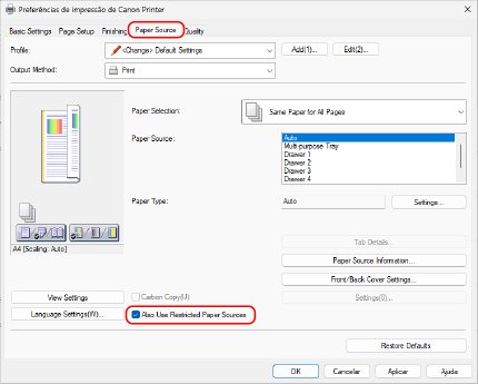 Na guia [Fonte de papel], marque a caixa de seleção [Usar também fontes de papel restritas].