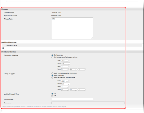 Para aplicar o firmware de maneira automática e imediata depois que download é concluído, selecione [Apply immediately after distribution]. Para aplicar o firmware automaticamente em uma data e hora determinadas, selecione [Apply at specified date and time] e especifique a data e a hora em [Year], [Month], [Date] e [Time]. Você também pode selecionar [Apply manually] para aplicar o firmware manualmente.