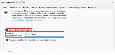 Na guia [Compartilhamento], marque a caixa de seleção [Compartilhar esta impressora] e digite um nome compartilhado.